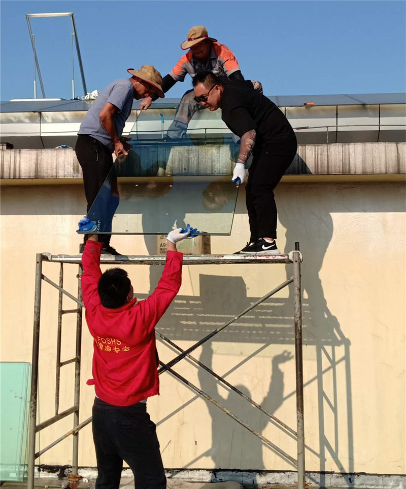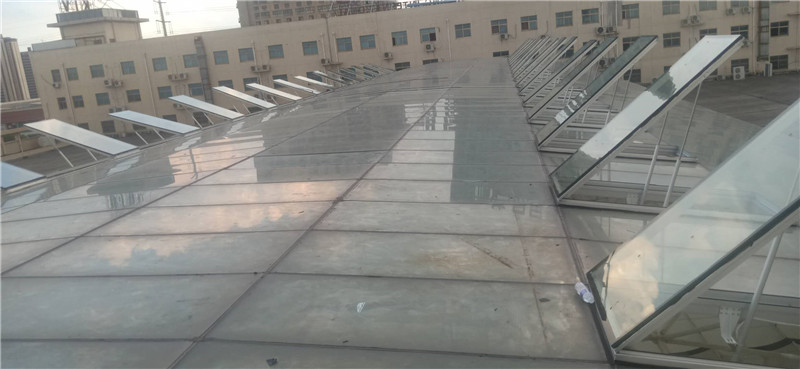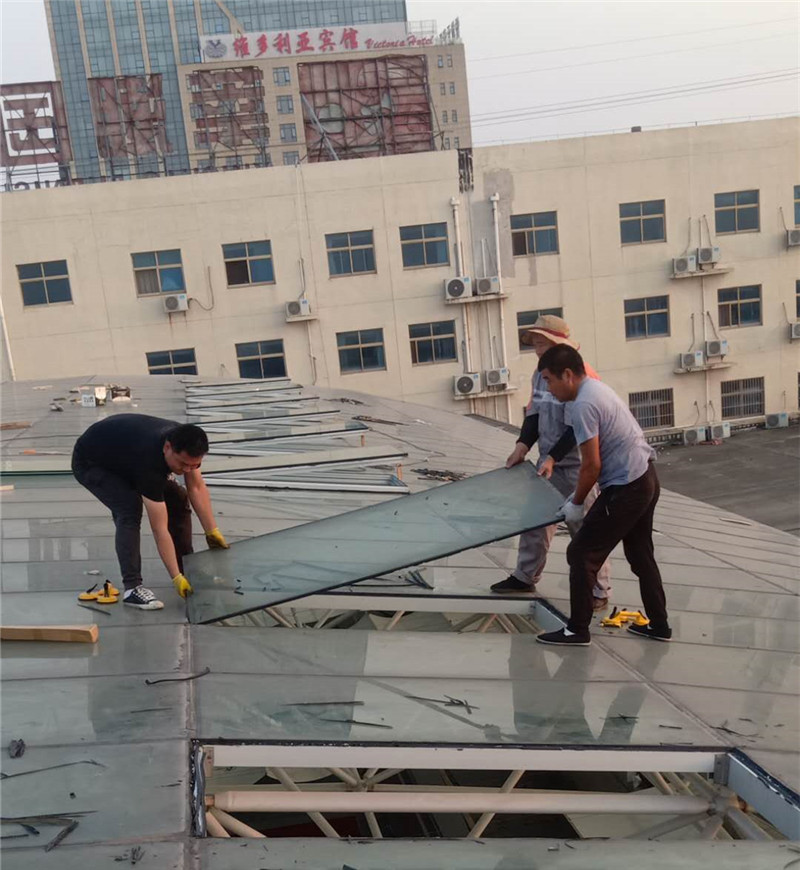 根據(jù)施工圖紙,需先將部分采光玻璃拆除,光滑的玻璃屋面給現(xiàn)場施工增加了難度。現(xiàn)場環(huán)境不允許大型作業(yè)車入場作業(yè),鑫友售后安裝部員工硬是憑自身力氣將一塊塊玻璃拆除,更換上鑫友電動排煙窗。