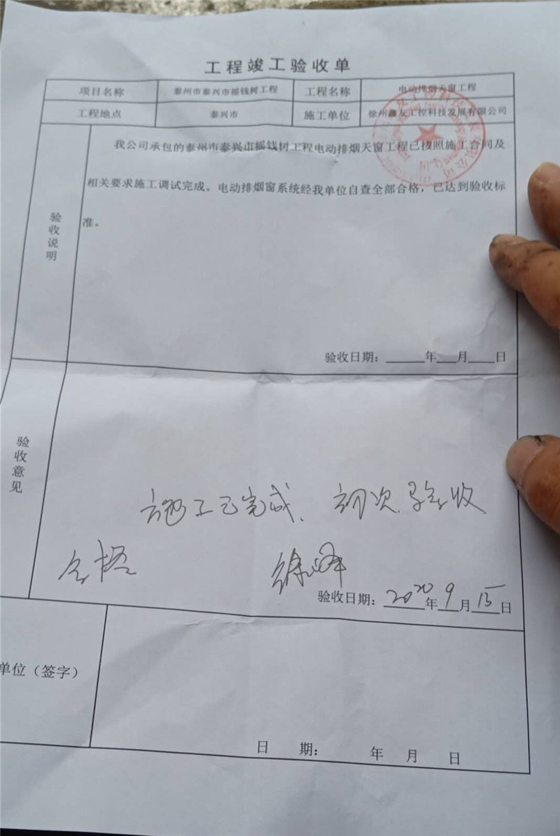 9月15日,現(xiàn)場進(jìn)行了初步驗(yàn)收,所有電動排煙天窗及配套設(shè)備運(yùn)行正常,達(dá)到驗(yàn)收標(biāo)準(zhǔn)!項目負(fù)責(zé)人簽寫工程驗(yàn)收單。