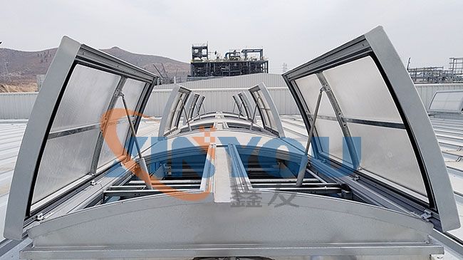 圓拱型電動(dòng)采光排煙天窗是工業(yè)建筑屋頂常用的一種通風(fēng)采光設(shè)施,主要材料通常采光不同規(guī)格的鋁型材,采光材料一般使用PC陽(yáng)光板或FRP采光板,圓拱形的設(shè)計(jì),外觀美觀大氣,能更好的防水,同時(shí)有效減少風(fēng)壓阻力,可連接消防聯(lián)動(dòng)控制系統(tǒng)及風(fēng)、雨、煙感應(yīng)器。天窗完全開啟時(shí),排煙量***,***開啟角度為90°。