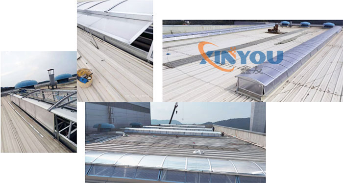 2. 圓拱型電動采光排煙天窗主要材料通常采光不同規(guī)格的鋁型材,采光材料一般使用PC陽光板或FRP采光板,天窗頂部為拱型,其好處是可以折射陽光擴(kuò)大室內(nèi)采光面積,且拱型的窗面利于夏季排雨,冬季又不易積雪,本身的自潔性較好,表面浮塵雨水沖刷,經(jīng)常保持較好的采光效果。