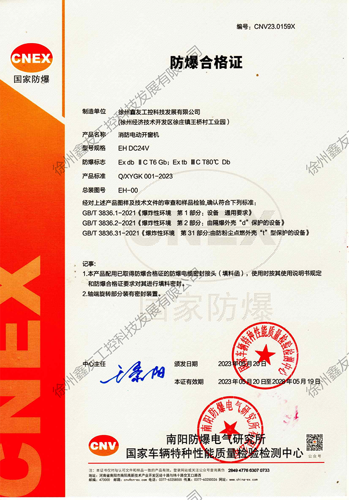 電動(dòng)螺桿開窗機(jī)防爆合格證書(粉塵環(huán)境下)