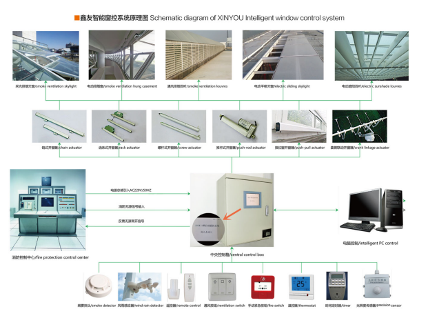 智能通風控制系統(tǒng)由智能控制箱、墻裝開關、遙控器、風雨感應器、開窗器等組成,用戶可根據日常室內環(huán)境的變化,通過遙控器或者開關來對窗戶進行開啟和關閉的控制。