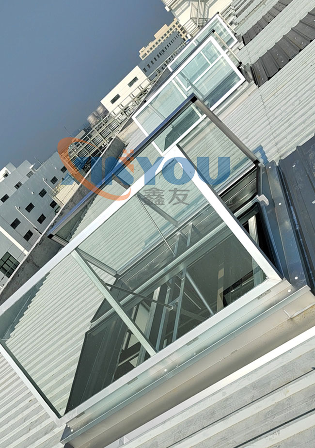 外觀為三角形,頂部為采光板,有效增加室內(nèi)采光,且防水性好。開啟電機(jī)設(shè)計(jì)成24V安全電壓,可連接消防聯(lián)動(dòng)控制系統(tǒng)及風(fēng)、雨、煙感應(yīng)器。***開啟角度為60°。